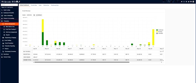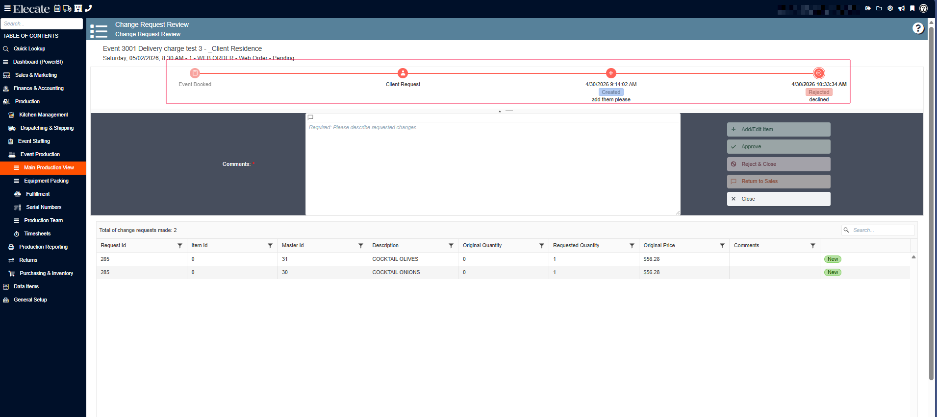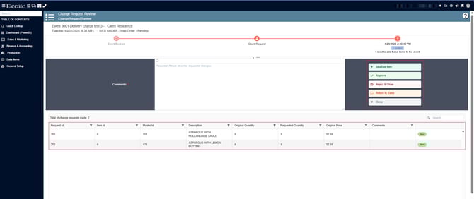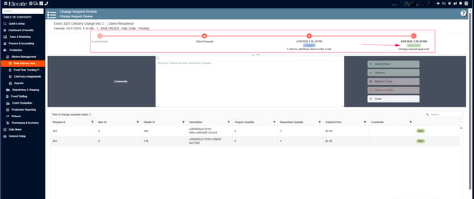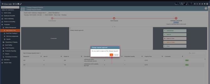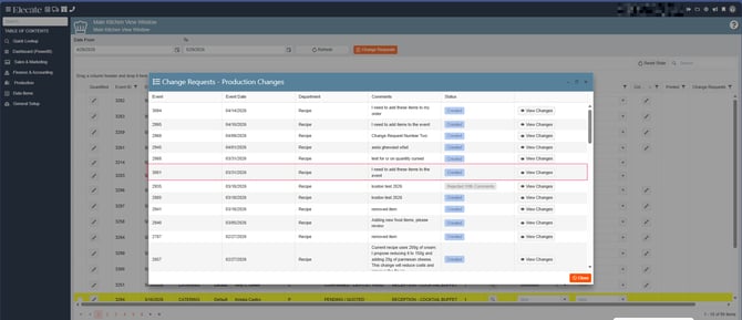 4. Once the Main Kitchen Window is open, a modal window will appear. This window displays all events with an active change request. Select the desired event to continue: