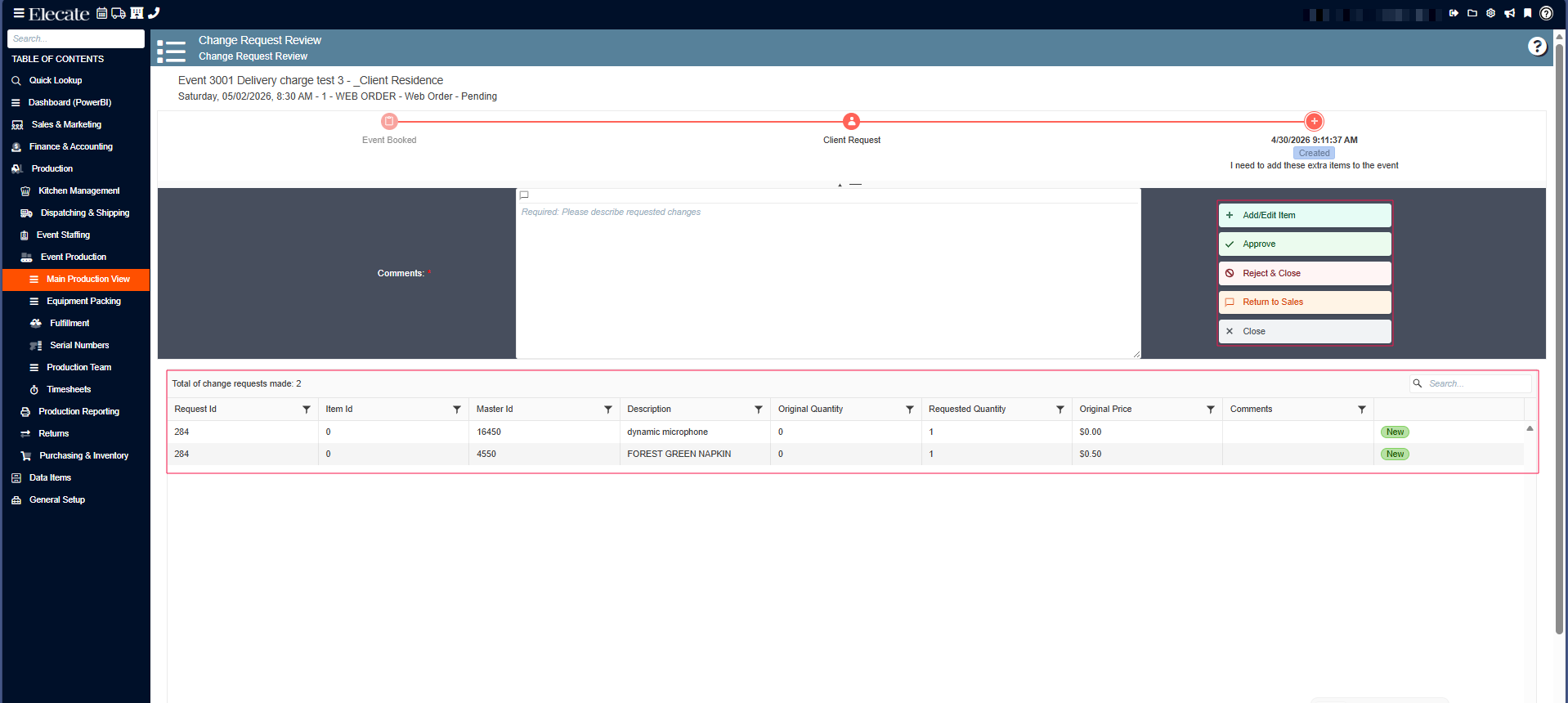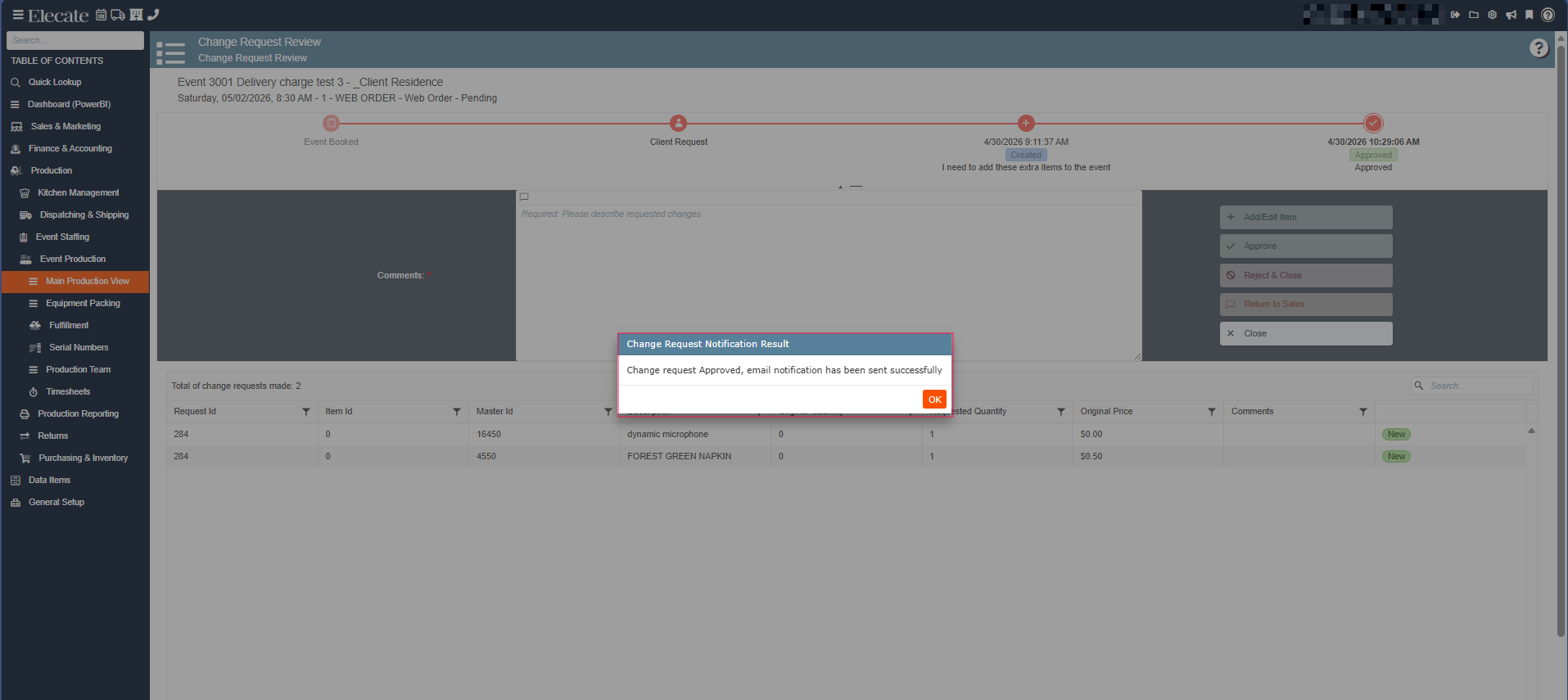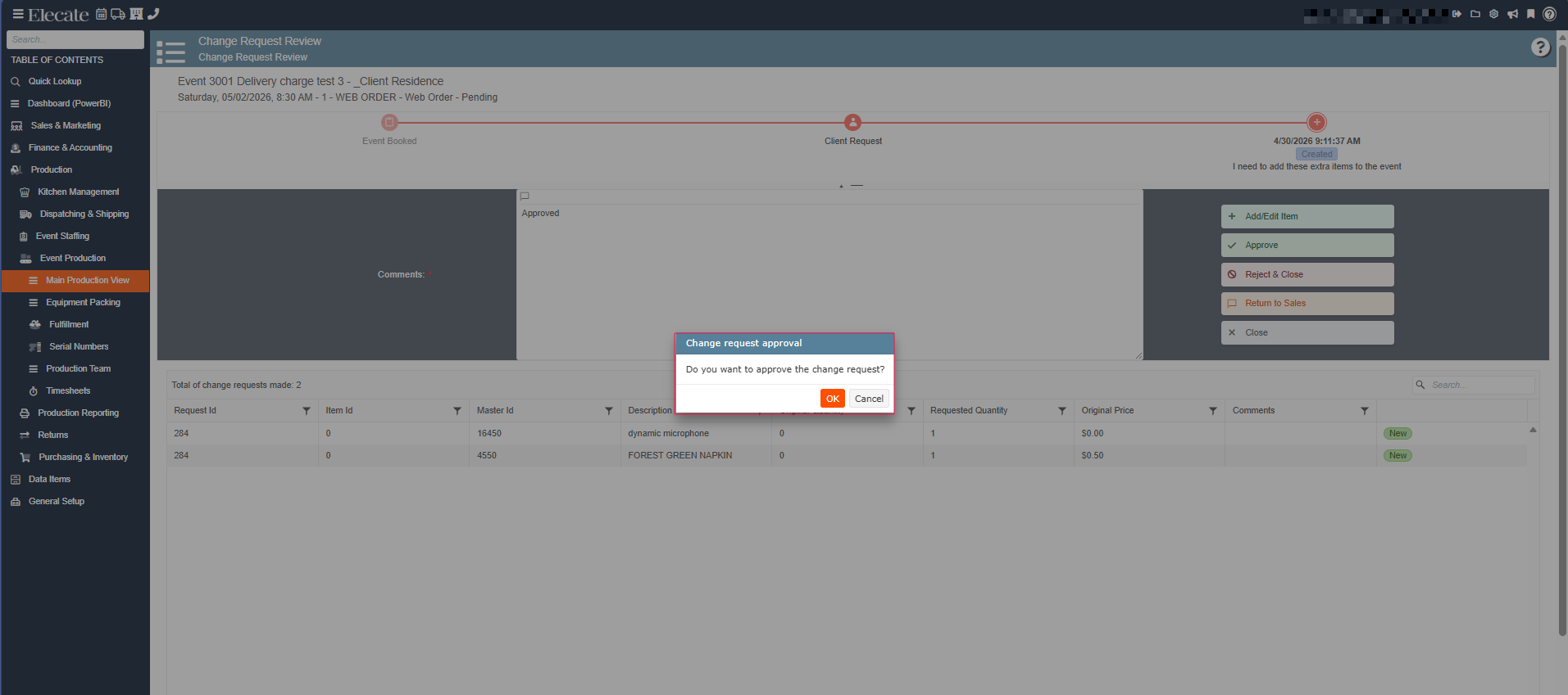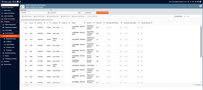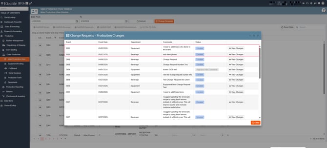 4. Once the Main Production View is open, a modal window will appear. This window displays all events with an active change request. Select the desired event to continue: