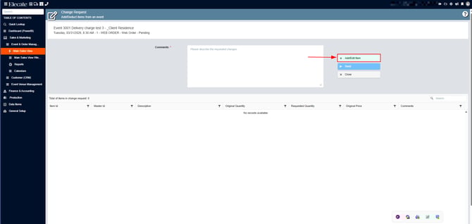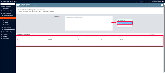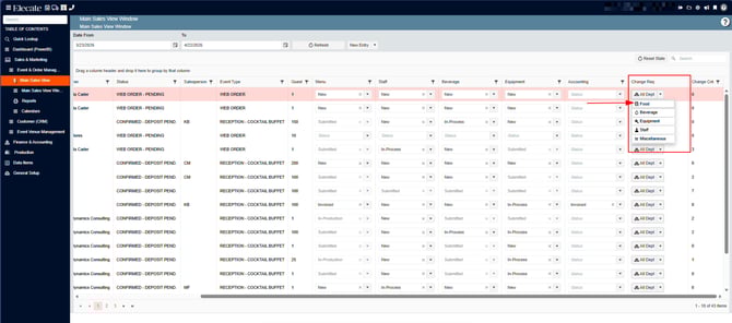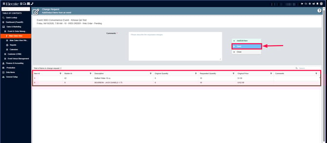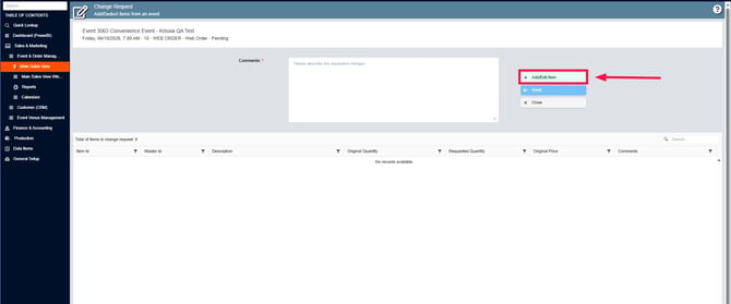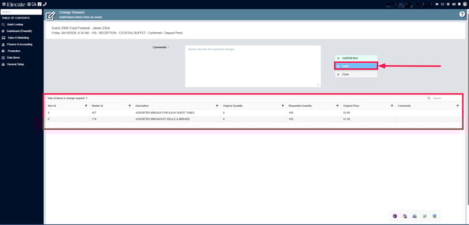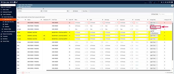 4. Search for the event, on the right side you´ll see the Change Request column, click on the drop-down menu, click on Beverage: