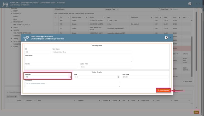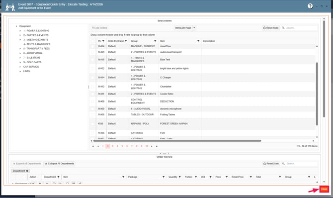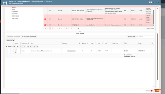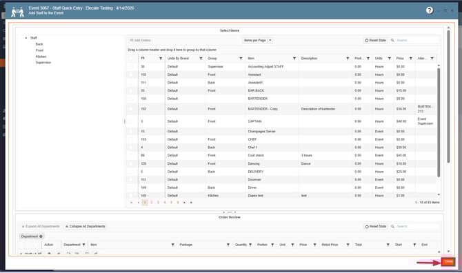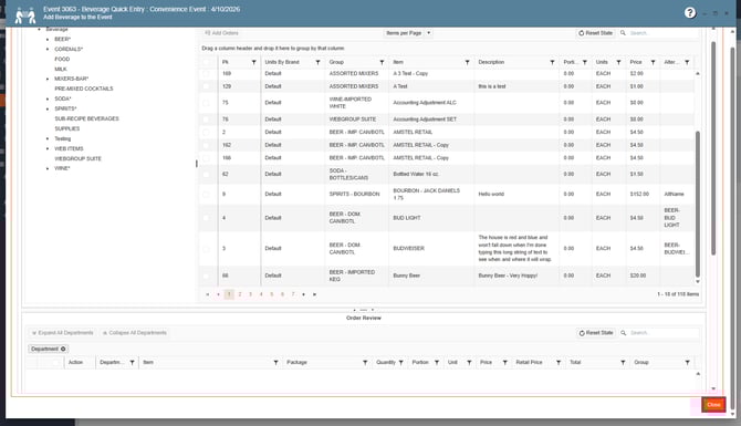 6. Add the new Beverage items to the event, press Close: