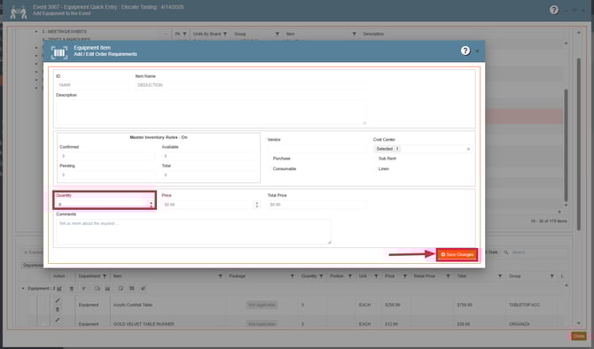 6. Add the new Equipment items to the event, press Close: