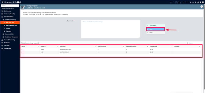 7. In the following window, you´ll see the list of items added through the change request feature, before sending the request, you must leave a comment: