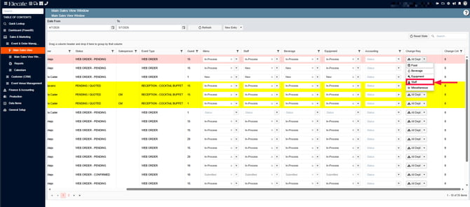 4. Search for the event, on the right side you´ll see the Change Request column, click on the drop-down menu, click on Staff: