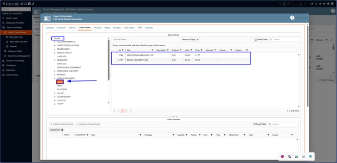 7. In the Order Details tab, you need to select the Jamix´s group, in order to add the items to the event, once you have added the items, then you can close and save the event: