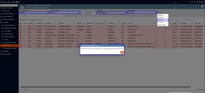 5. You need to select the Event Start and End Date, The Cost Center, the Delivery Date and from the Flash PO drop down, click on Jamix PO, the following pop-up will show up letting you know if the purchase was completed or not: