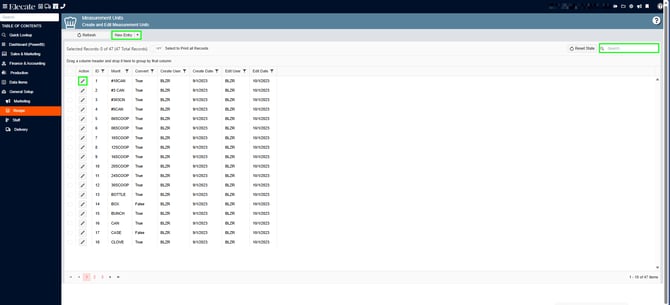 4. In the following window, you can create a new measure by clicking on New Entry, look for a measure in the search bar and edit the existing records by clicking on the pen Icon