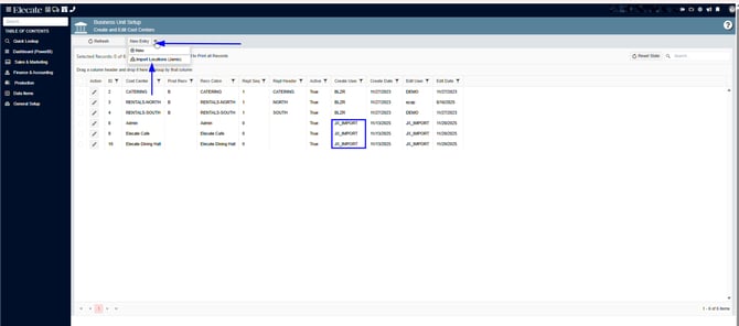 4. From the New Entry drop-down menu, click on Import Locations (Jamix):
