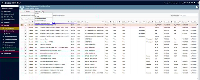 4. Click on the New Entry drop-down menu, select Import Food Items (Jamix):
