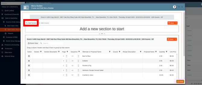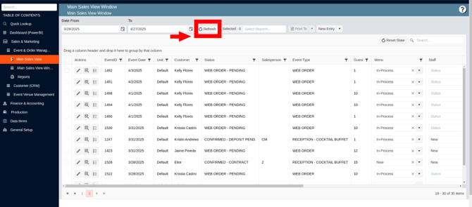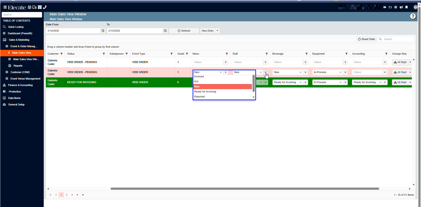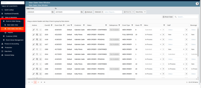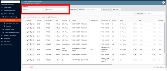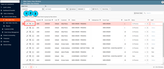 In Process: Currently being worked on by the salesperson, where the event is being edited, updated, or items are being added/removed before sending it to the corresponding department (kitchen, staffing, operations).