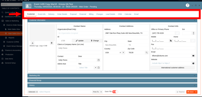 Here you can edit the information inside of each of the tabs (customer, event, etc).