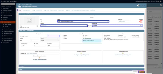 5. When creating a new recipe, start by entering the recipe name. Then, select the Master Filter and Groups. Next, navigate to the Recipe Serves & Production Rules section. In the Recipe field, enter the number of servings.