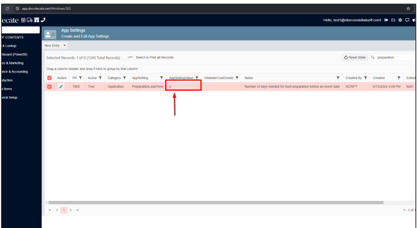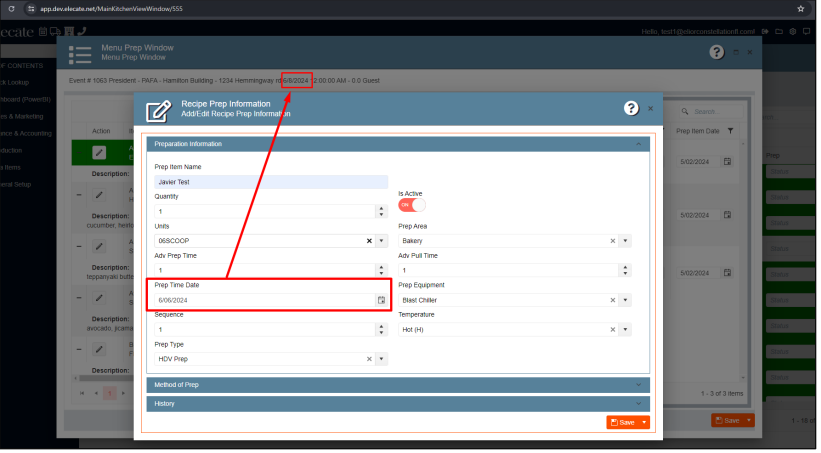 3. Setting the default to two days prior to the event date on the Menu Prep Window: