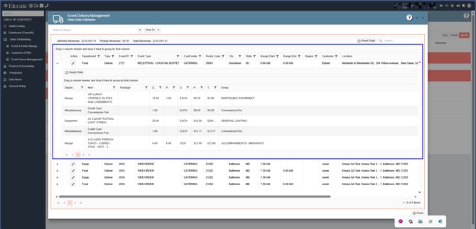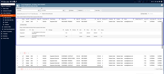 - Clicking the plus icon opens an inline preview panel (row detail) showing event items grouped by department: Recipe, Bev, Equipment, Misc, Staffing.