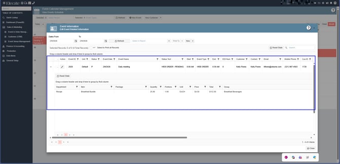 5. Select an event from the calendar and click on + icon to expand the information related to the items added in the event: