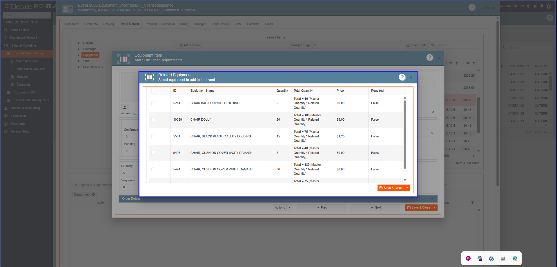 - If the user hits Save & Close and has not selected the related item to be added, then a Save must not be trigger and the modal window for both the related item or the equipment item must be closed.