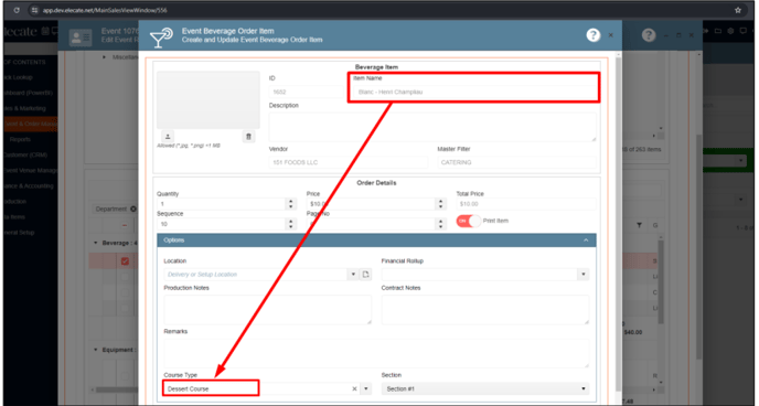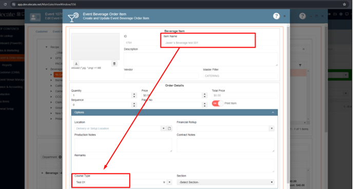 It was added two dropdowns in the Crud editor for Recipes and Beverages to select Course Type and Section, dropdowns are optional. These functionalities added will help to display and organize the information on the Menu Builder, so the user can identify where the items were added.