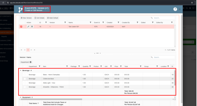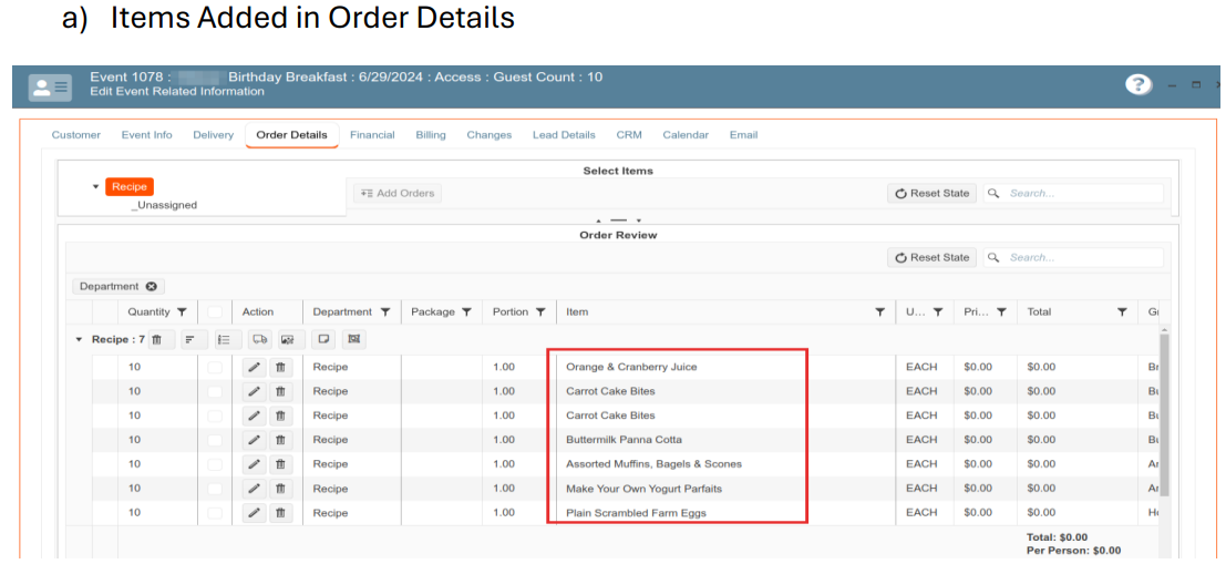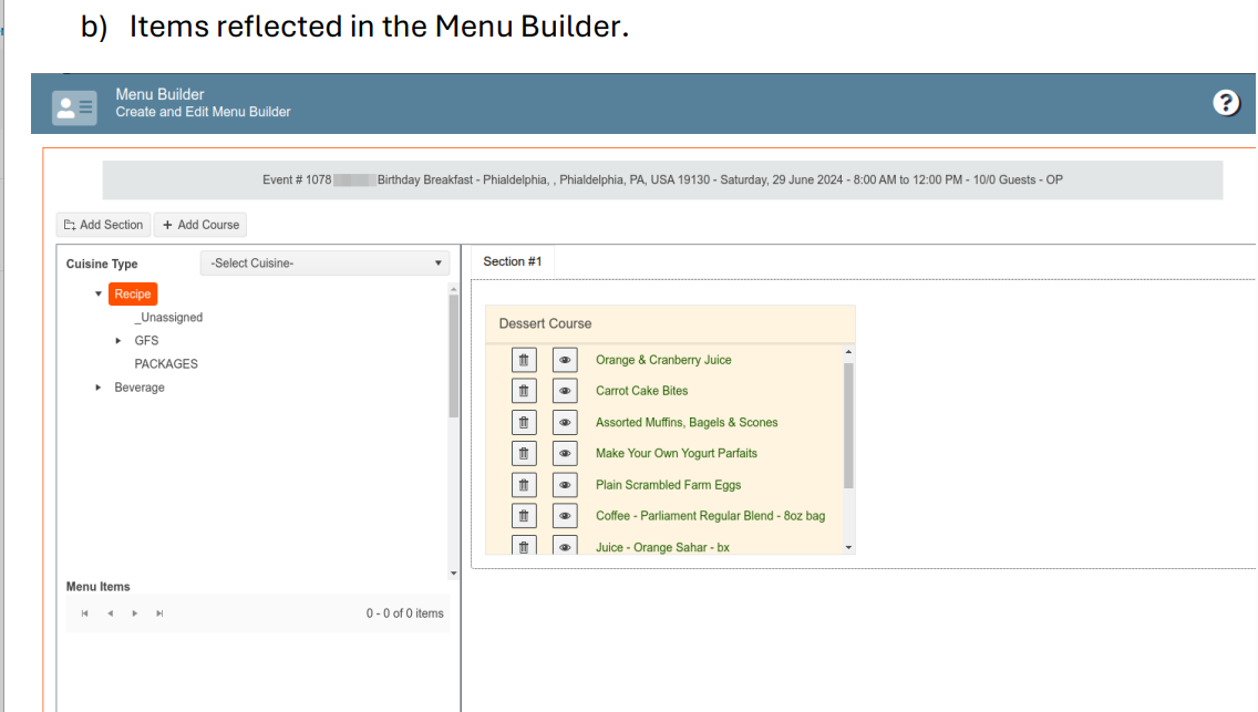 11. Menu Builder will display the items added through the order details tab with the course type and sections selected.