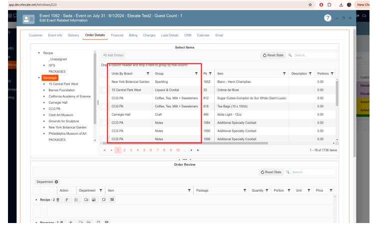 2 Columns were added to the order details tab on the top grid view, these are called: Unit and Group, the columns are visible when you select one of these categories: Recipe, Beverage, Equipment, Miscellaneous and Staff. Group column is visible only when the department root node in the tree view is selected.
