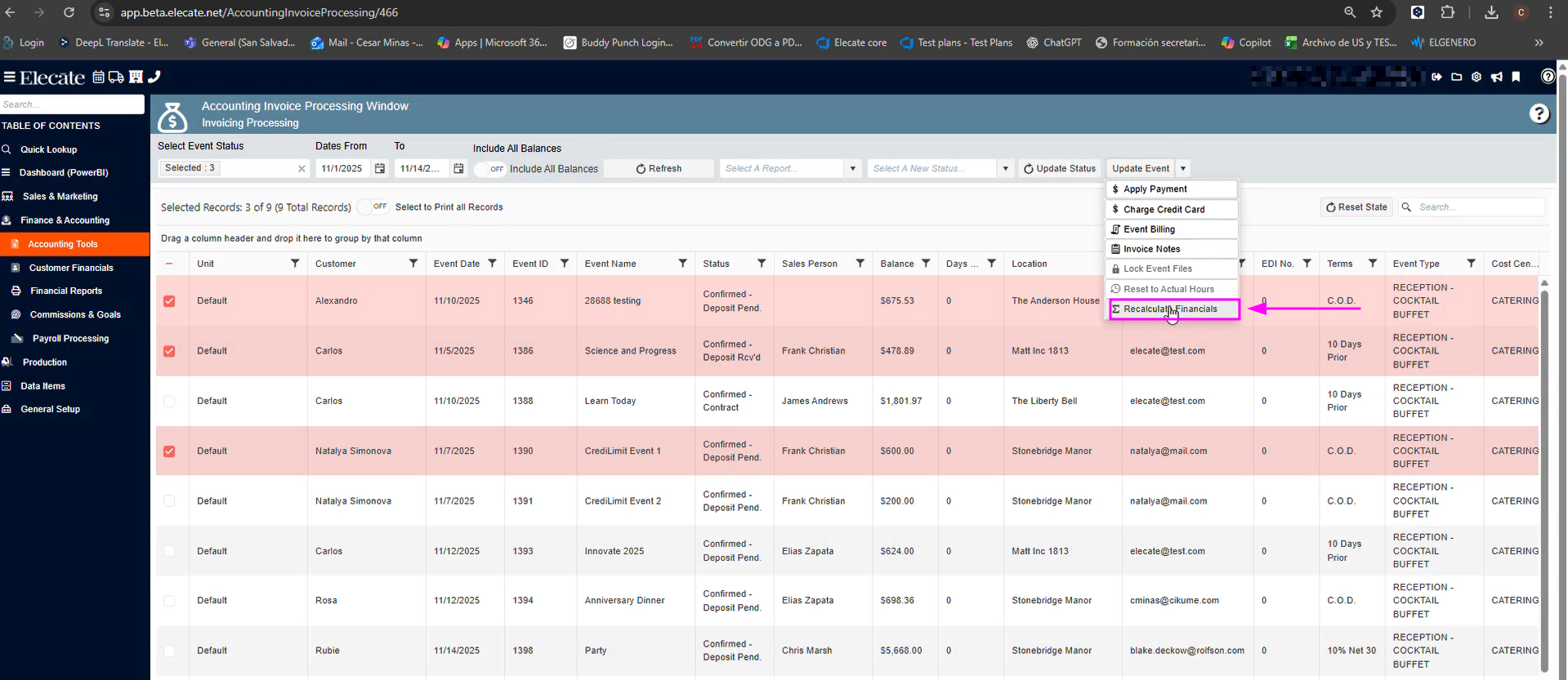 - When they want to check multiple events' financial info in the Accounting Invoices Processing window