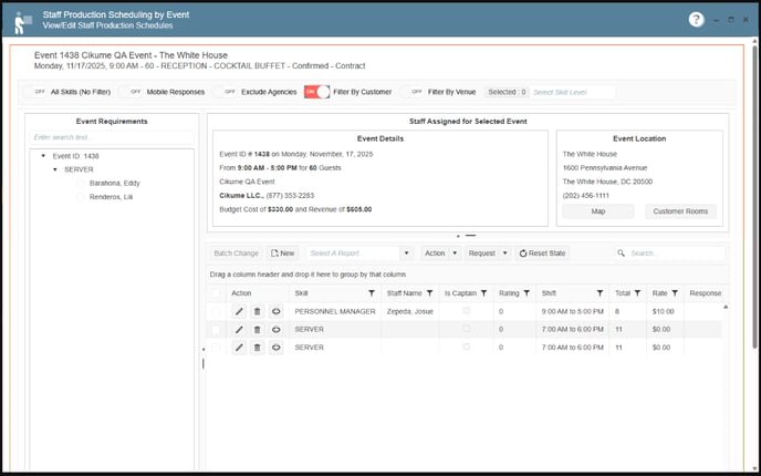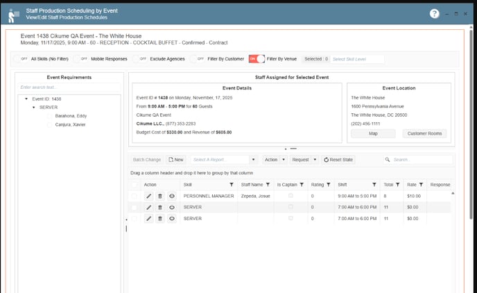 - The filter should work that if you linked a staff person to a venue (without the need for staffing) as soon as you access this screen and you filter by Venue, you should be able to see the staff members that have been associated with that specify venue