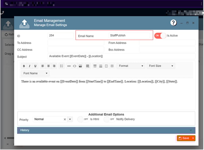 3. In the search bar, type in StaffPublishEmailPk, make sure to enter the value 254 and the Is Active toggle ON: