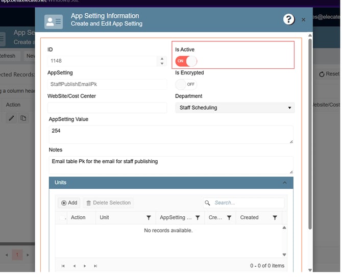 2. StaffPublishEmailPk AppSetting: Active and properly configured: