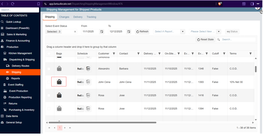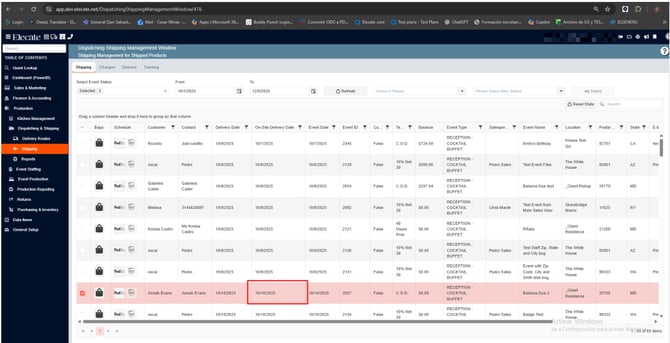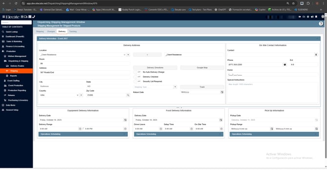 When they want to consult the Shipping or Pickup grids then they will find the On-Site Delivery Date column that can be updated from the Event card's Delivery section, on the On-Site Delivery info, following a format `MM/DD/YYYY.