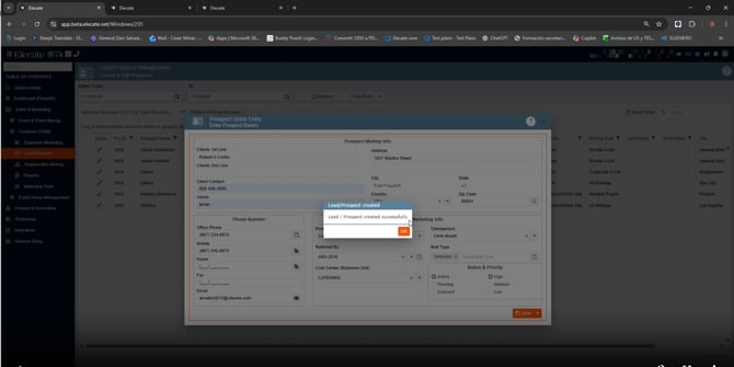 After clicking Save in the Lead/Prospect Quick Add modal:- Display a success message (e.g., “Lead/Prospect created successfully”) or an error message if the creation fails.