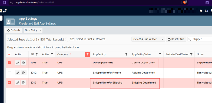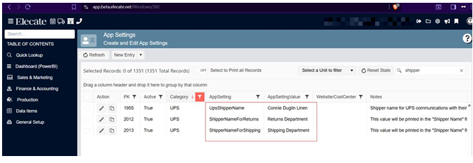 3. Make sure the following apps have the correct values: Connie Duglin Linen, Returns Department and Shipping Department