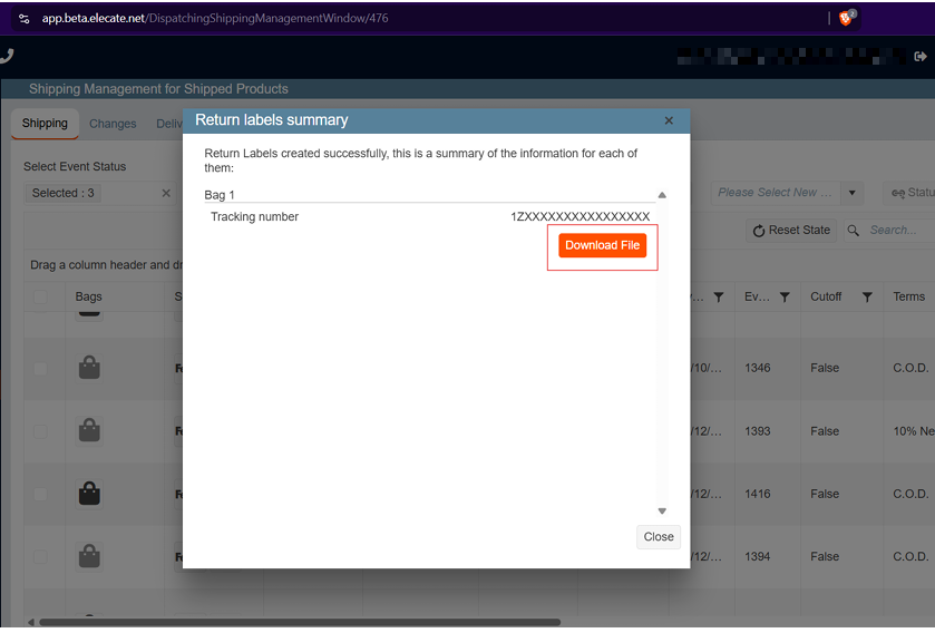 4. Pick an event, click on the bag icon, enter the bag´s number, choose Save and Continue, click on Next and Confirm, the Return Label Summary window will appear with the information related to the bags, finally select Continue