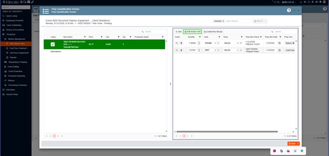 4. A window will pop-up, on the left side you will see the recipe item, click on the pen icon, on the right side you will see the Recipe Prep items, click on the Edit Master Data bottom
