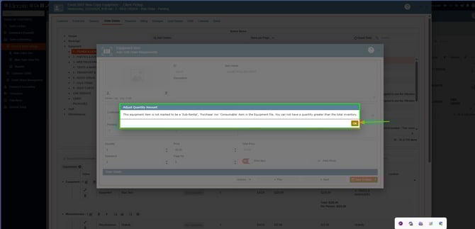 5. Add Equipment items to the event, if the item has the inventory rule ON, the following warning will pop-up: