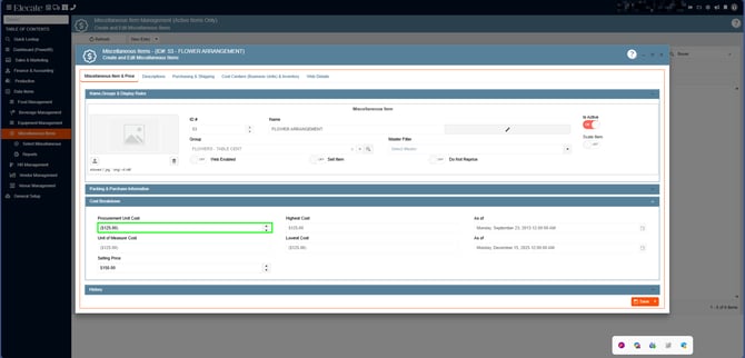 4. Open an existing item, go to the Cost Breakdown section, in the Procurement Unit Cost field, enter a negative value