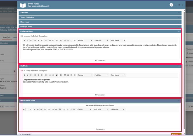 Increase the Miscellaneous Notes box in Event Notes by 30% to allow more visible text without resizing, add the ability for the end user to expand the field to full screen, and support editing and text formatting, while ensuring that all existing functionality remains unchanged.