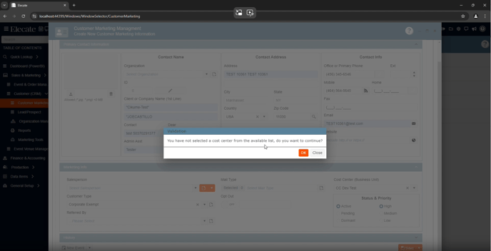 15. Adding a Validation Message to add the Cost Center when creating a customer: