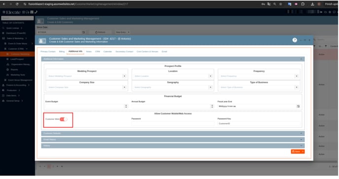 9. Open a Customer, go to the Additional Info tab, in the Allow Customer Mobile/Web Access section, you will find the Customer Web Toggle.
