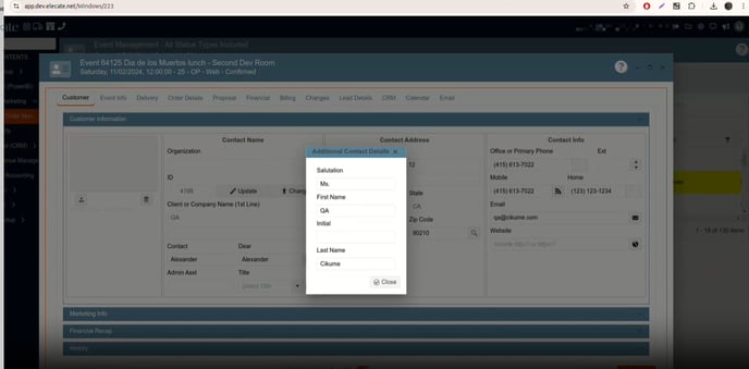 The conditions for displaying the pop-up need refinement to prevent it from appearing if a Contact Name (First Name) and Dear (Last Name) already exist in the event. Additionally, enhancements are required to ensure the Model Data is validated correctly under these conditions.