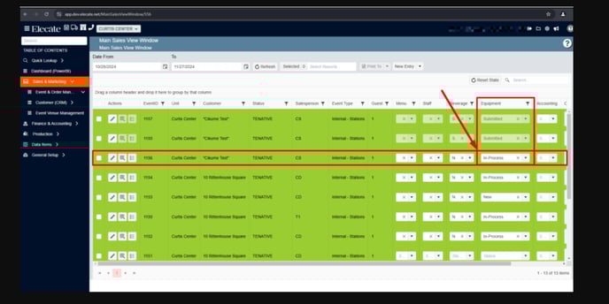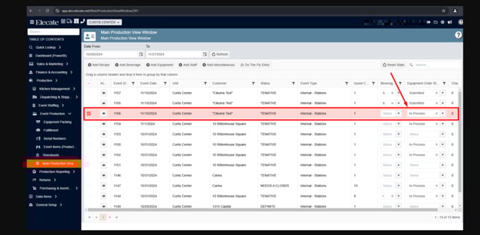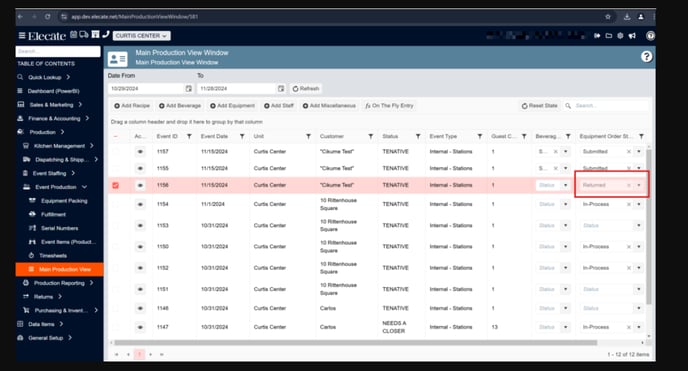 The users will be able to change the status of an equipment order from the Main Production view screen by changing it to returned; by returning the order, the Sales user can edit their order again.