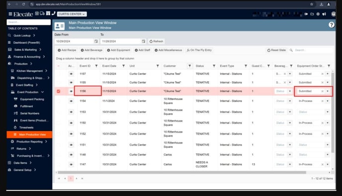 Once a sales user has submitted their equipment order, the equipment column of the Main Sales View and Main Production View should reflect submitted.