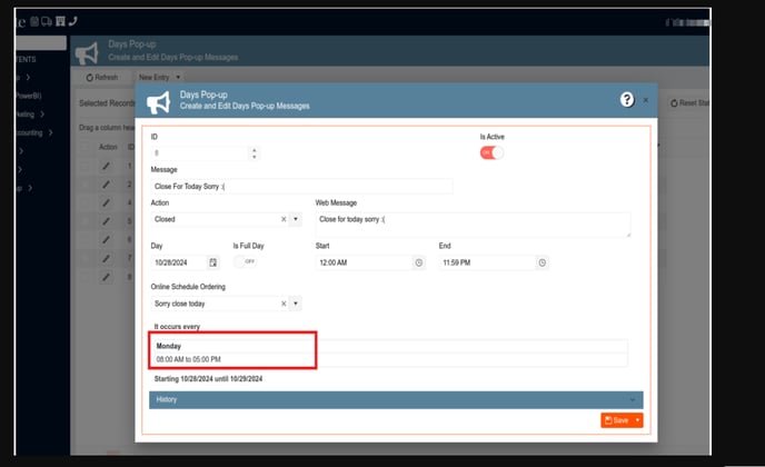We need to link the "Delivery Schedule Table" to allow users to set the schedule according to its functionality. Additionally, users should be able to directly set an "effective date" for the date range when the soft close will take effect. The "History" section, found in various windows throughout the application, will be used as the required log. This section typically includes values for "Created by," "Edited by," "Created Date", and "Edited Date".