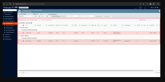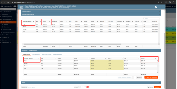 The Invoice column on the Financial tab of an event is populated with totals by revenue code.