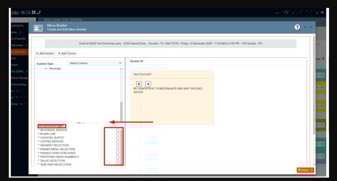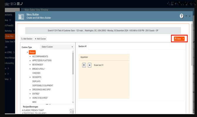 The Event Sales Menu Window has been copied and placed at the bottom of the Menu Builder window, all functionalities for both the Menu Builder and Event Sales Menu Window remain intact, a screen divider allows users to show or hide each screen by dragging it. A Save button enables users to save changes on each screen, with changes reflected on both screens after saving.