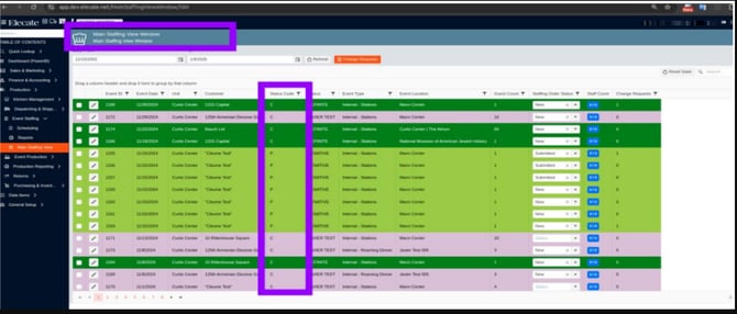 Staff, Production and Kitchen modules. Specifically, in each view there is a “Status Code” column that clearly and accurately indicates the status of each event.