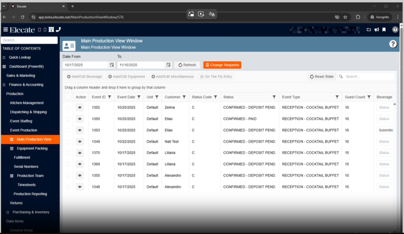 - The event can other departments like beverage, equipment, misc or staffing
