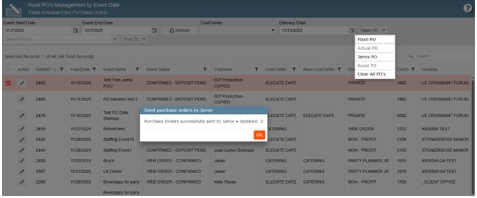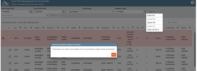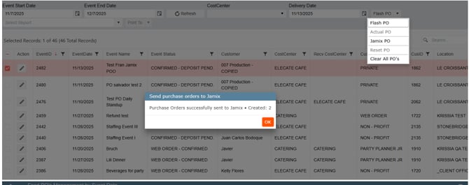 5. Select the Event Start Date and Event End Date, next click on Refresh, put a check mark on the desire order, then from the Flash PO drop-down menu, select Jamix PO