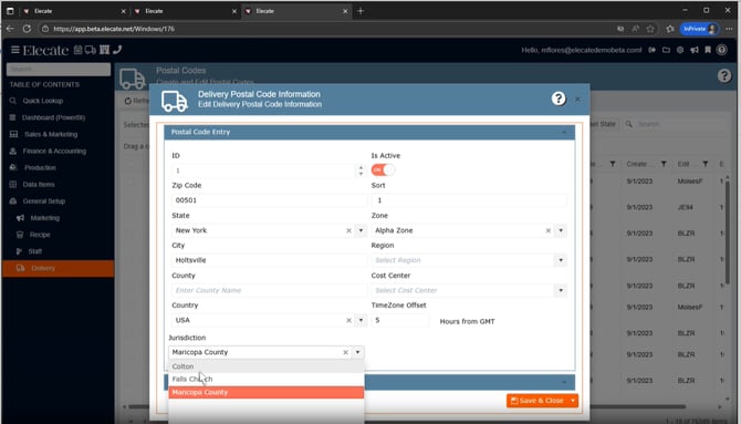 - In the Delivery Postal Code Information window, we need to have a dropdown that will pull the information from the "Jurisdiction" table.