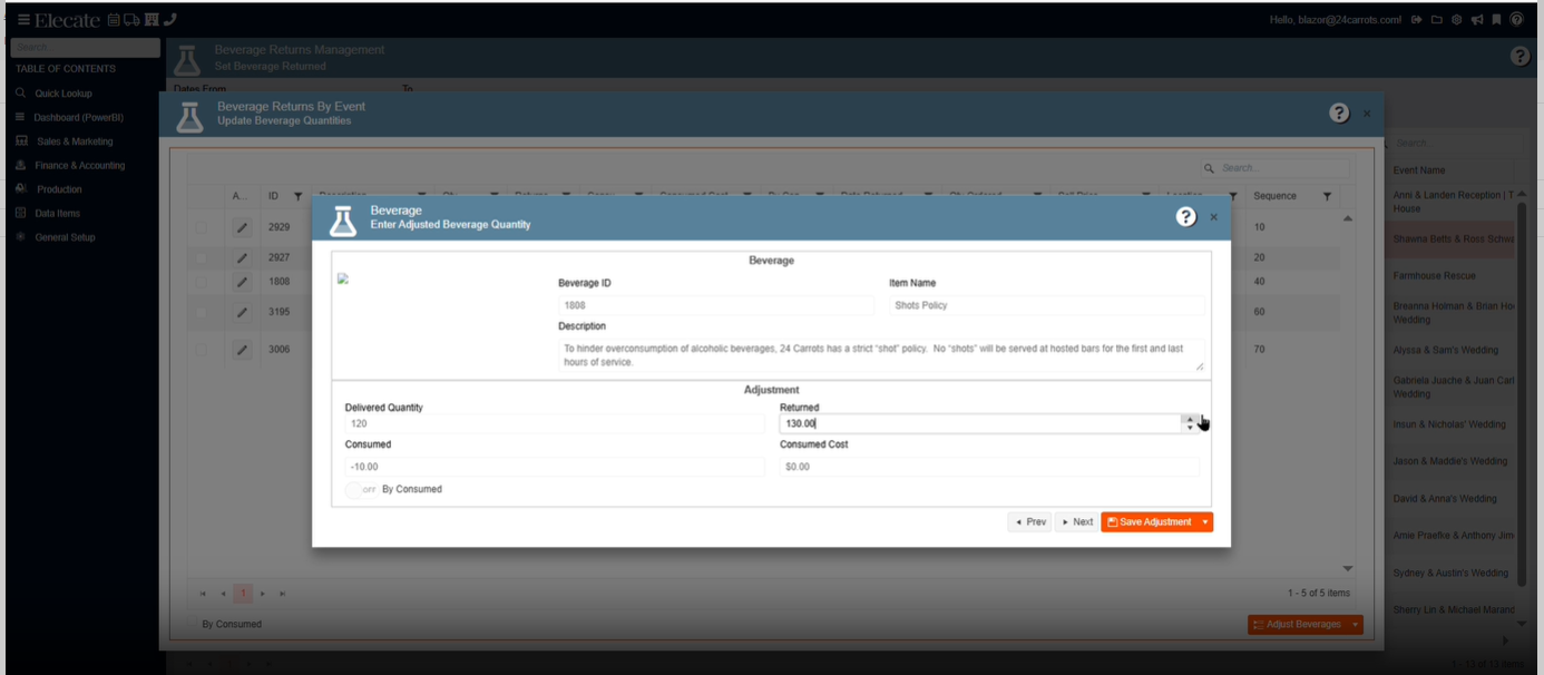 - Allow users to input decimals on the "Returned" field that can be found on the Beverage Returns By Event window.