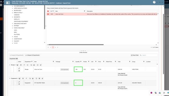 6. Go to the Order Details, look for the Recipe item that you previously modified with the Equipment and add the item to the event, under Order Review you will be able to check, if the recipe and the equipment item were added to the event and the quantity for each item: