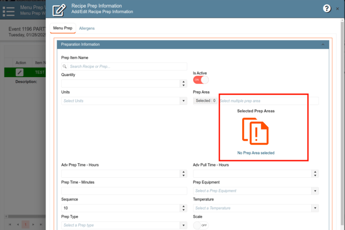 A UI improvement of the Prep Area dropdown field on the Recipe Prep Information screen has been made. Already selected Prep Areas will display in blue chips, and a drop down will remain to allow the user to select additional areas.