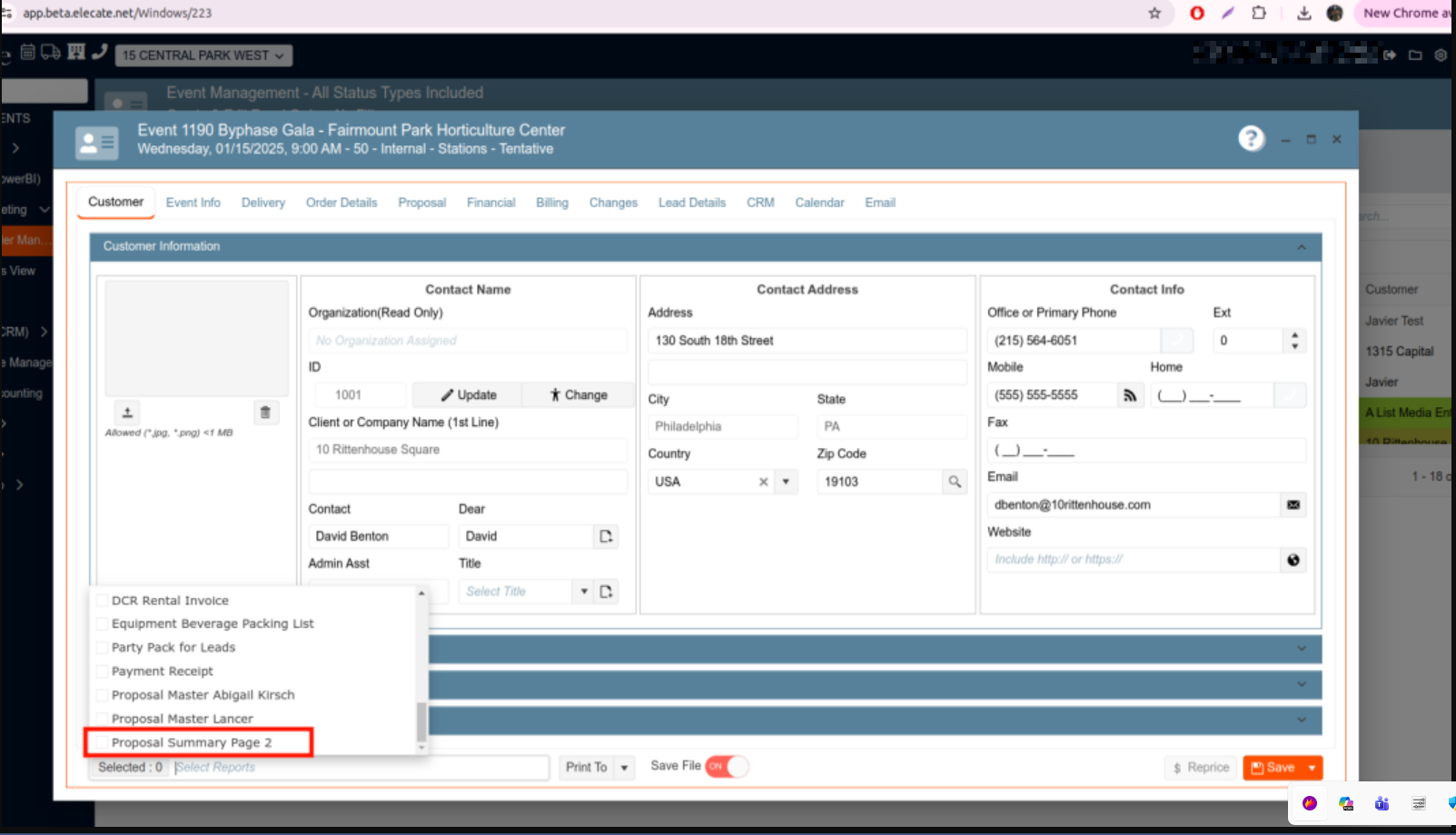 The report name was changed from "Corp Proposal Financial" to "Proposal Summary Page" in the drop down. The report now reflects the "Roll Up" logic that was implemented on the Proposal tab, meaning, when the roll up is toggled on for two or more categories, those line items do not print, and instead, the roll name, description, and price prints.